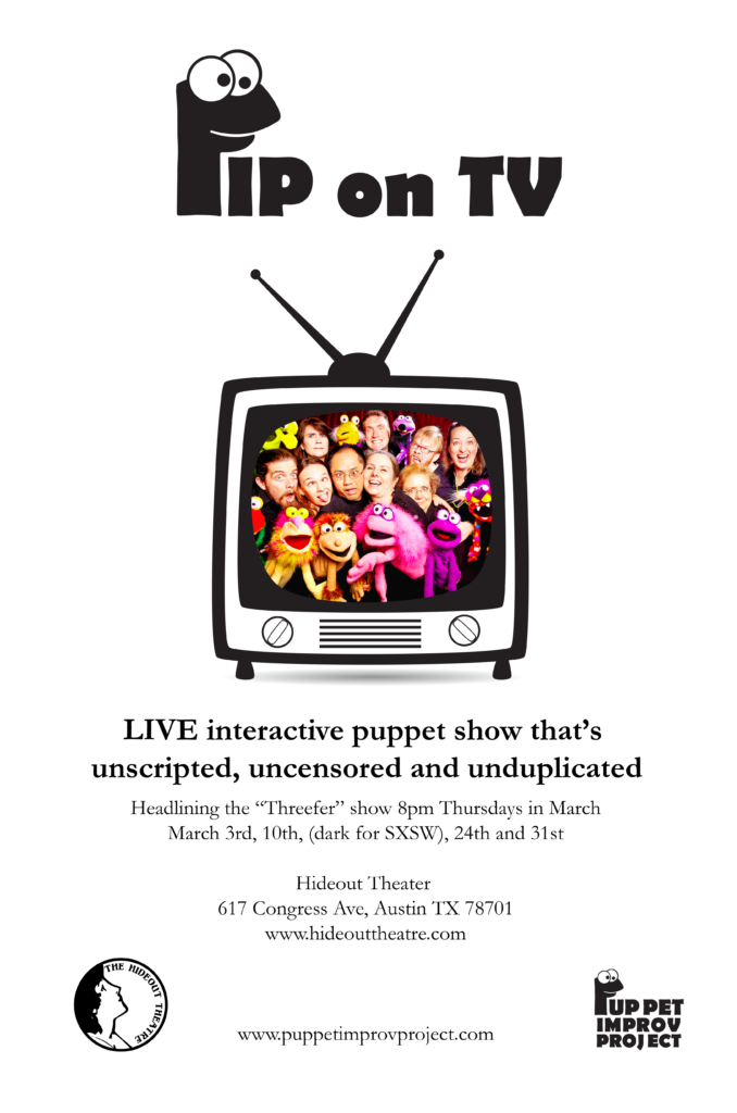 This show headlined The Threefer @ The Hideout Theatre in Marck, 2011. The show had games and scenes performed using standard televised-puppetry techniques, where the performers hold the puppets above their heads, and video footage of the performance crops out the performers below the bottom of the frame.